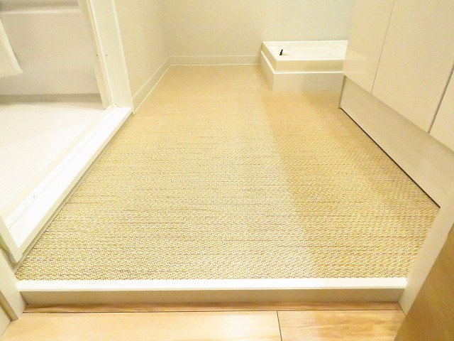 廊下を進んですぐ右側の扉が洗面室。洗面化粧台、洗濯機置場、バスルームがまとまっています。