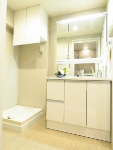 洗面化粧台と洗濯機置場はお隣同士。鏡の裏、引き出し、吊戸棚など小物の収納スペースが豊富です。余計な収納家具を用意しなくていい分、脱衣スペースは有効的に利用できそうです。