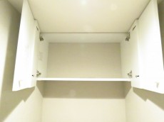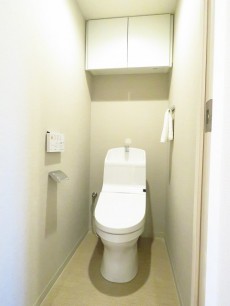 トイレは洗面室のお隣。ウォシュレットとペーパーのストックの保管に便利な吊戸棚が設置されています。