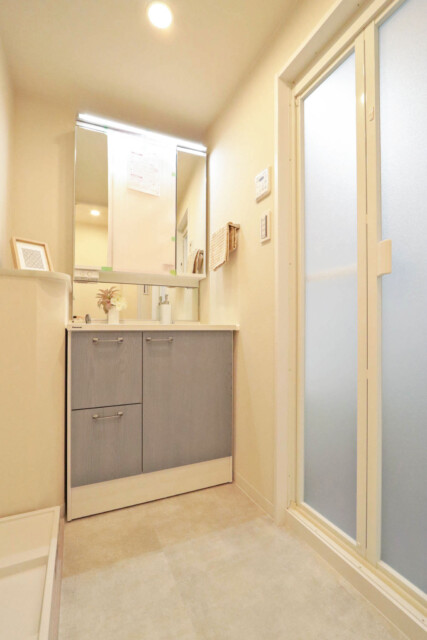 洗面室には洗面化粧台の他に洗濯機スペースと浴室がまとまっていて、脱衣所も兼ねています。洗面化粧台は身だしなみを整えるのに便利な三面鏡付き。裏はキャビネットになっているので洗面周りの細々したものもスッキリです。