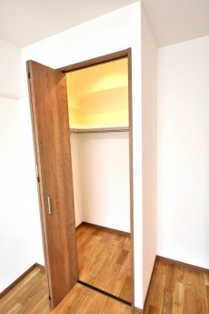 このお部屋にはウォークインクローゼットがあります。奥行きがあり、棚がL字になっています。