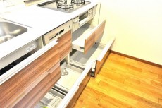 キッチンには下部と上部に収納スペースがありますので、調理器具がたくさん入ります。
