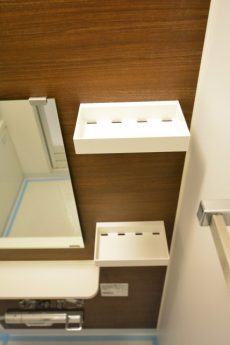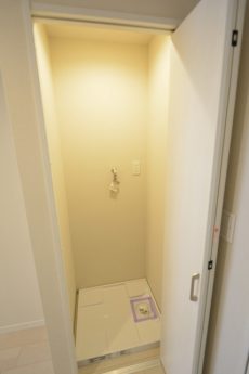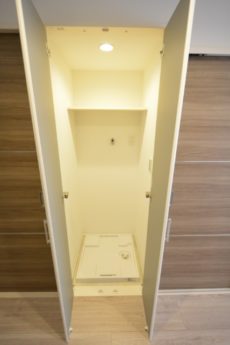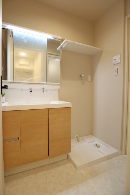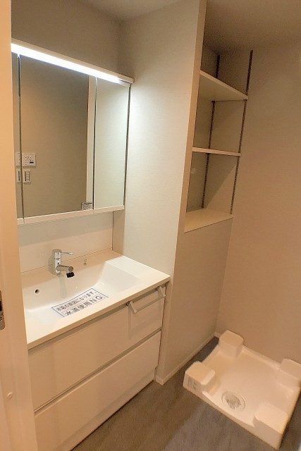 洗面台に洗濯機置場にリネン類など置ける棚ですね