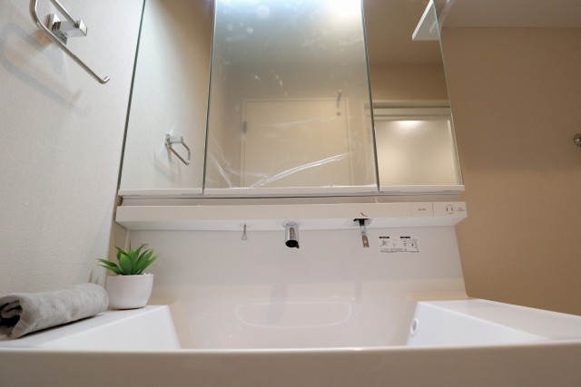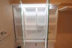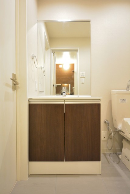 まずは洗面台です。三面鏡ではなく大きな一枚鏡が豪華な感じ。