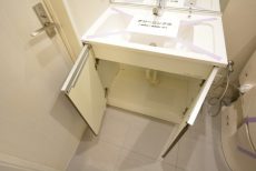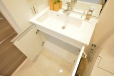 収納はキャビネットと洗面台下。細かい物が多くなりがちな洗面周りにはキャビネットがあると助かります。