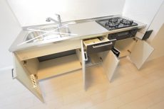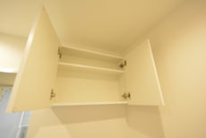 吊戸棚と調理台下に引き出しタイプの収納。引き出しタイプは奥の方まで出し入れがし易くて助かります。吊戸棚はあまり使わない物を入れるか、収納グッズなどの力を借りるといいですね。