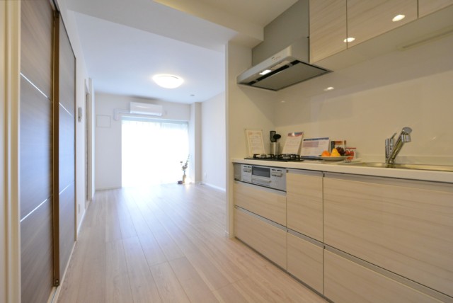 こちらは約10帖のリビング・ダイニング・キッチン。縦長のお部屋で手前に壁付けのキッチンが設置されています。手前からダイニング、リビングとレイアウトがし易そうですね。