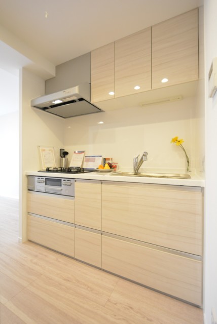 お部屋の雰囲気に合わせた木目パネルの調理台です。