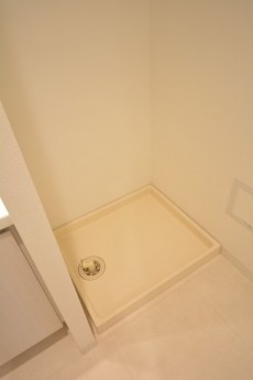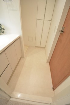 洗面室は入口入って正面に洗面台と洗濯機置場、右手にリネン庫、