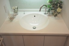 ミントグリーンのタイルがさわやかな洗面化粧台。