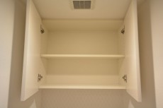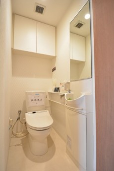 トイレは洗面室をでてすぐ右手になります。ウォシュレットと吊戸棚、手洗い場つきと