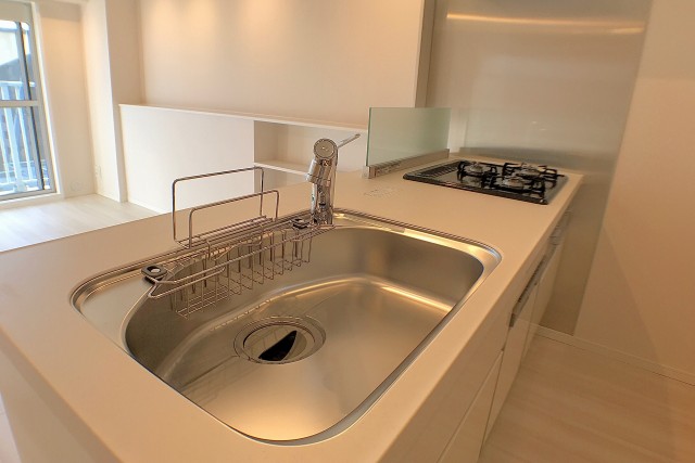 大きなシンクが付いた水栓、3口のグリル付きガスコンロがありますね!!