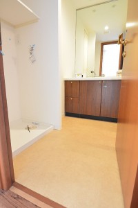 洗面室は入口入って右手にバスルーム、正面に洗面化粧台、左手に