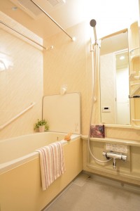 あたたかい色合いでリラックスできそうなバスルーム。