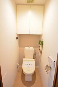 ウォシュレットと吊戸棚付き。トイレットペーパーのストックもスッキリ収納できます。