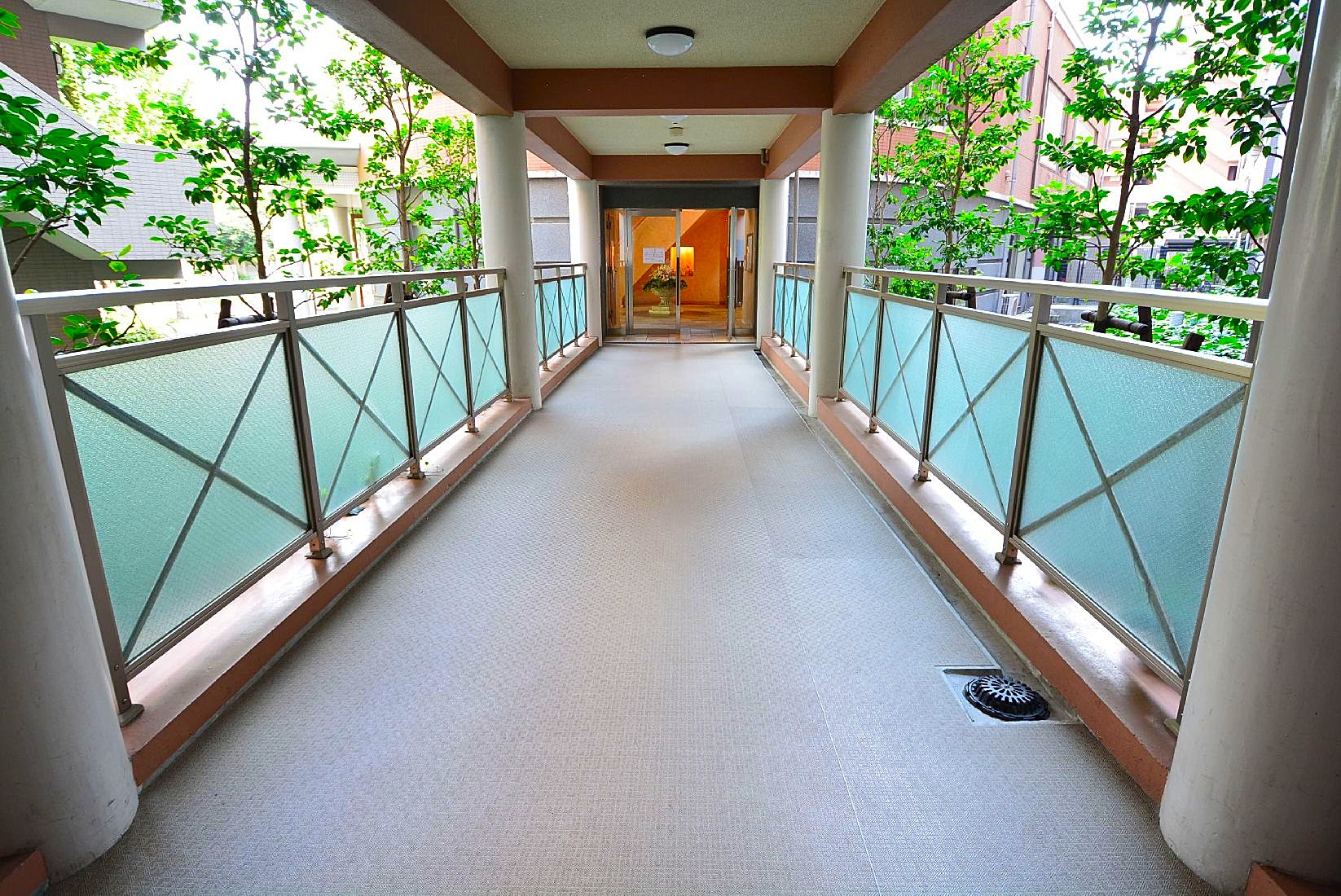 エントランスホールをぬけて渡り廊下を通りエレベーターへ。