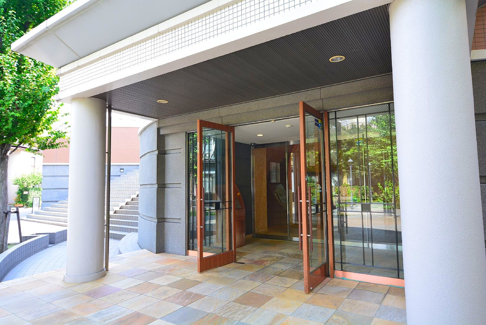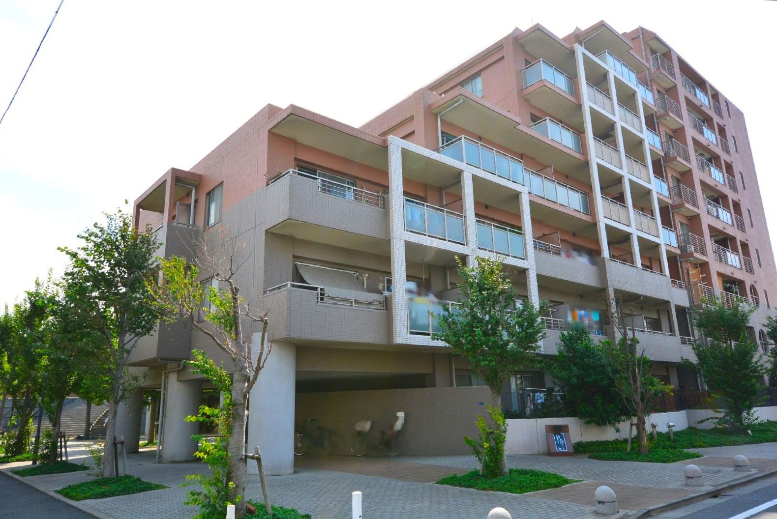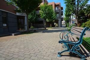マンションまわりには木々が植えられ、ベンチもあったりして周囲はゆったり