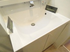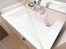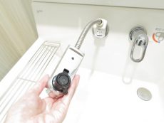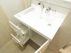 洗面化粧台は鏡の裏が一面収納になっており、ゴチャゴチャ散らかりがちな水廻りの小物もスッキリ片付きそう!蛇口は引っ張るとシャワーになるので花瓶の水入れやお掃除もしやすいハズ。