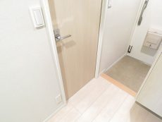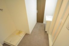 壁面には調湿・消臭効果のあるエコカラットが横に長く設置されています。生活臭も緩和されて快適な生活が送れそうですね。入口横にはちょっとした物の置場に便利なカウンターもつくられています。