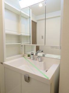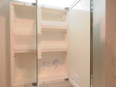 洗面台は三面鏡付。360°確認出来て身だしなみのチェックに重宝しますね。三面鏡裏は、細々としたものが多い洗面周りに嬉しいキャビネットになっています。