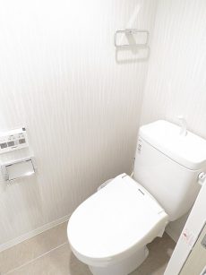トイレはTOTO製洗浄機能一体型。トイレットペーパーのストックや掃除道具を入れるのに便利な吊戸棚も付いています。