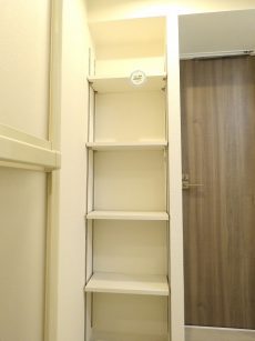 洗濯機置場の横にも収納スペースがつくられています。洗剤や洗濯ネットも洗濯機のすぐそばに置いておけますね。