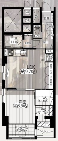 お部屋は12階、専有面積57.71㎡、間取りは2LDK。収納豊富なお部屋で、シングルまたはDINKSの方にお勧めです。ワークスペースとサンルームが気になりますね。