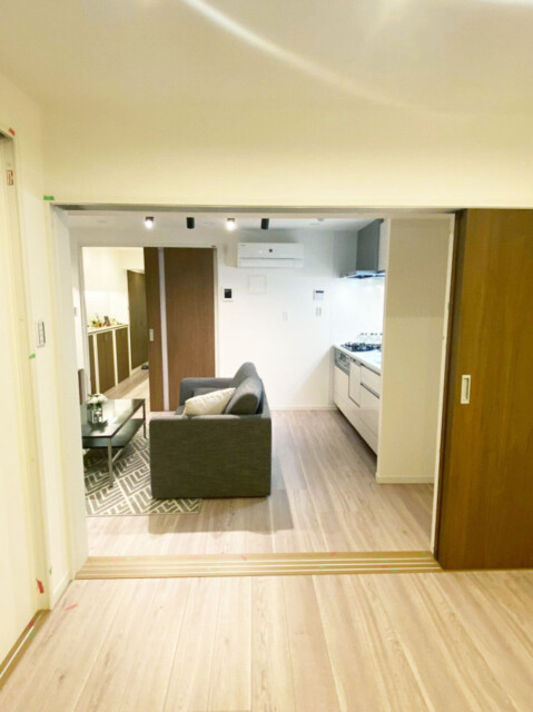 扉の奥は約14.1帖のLDK。家具が置かれているので実際の生活イメージもつきやすいのではないでしょうか?(設置された家具もついてきます。)