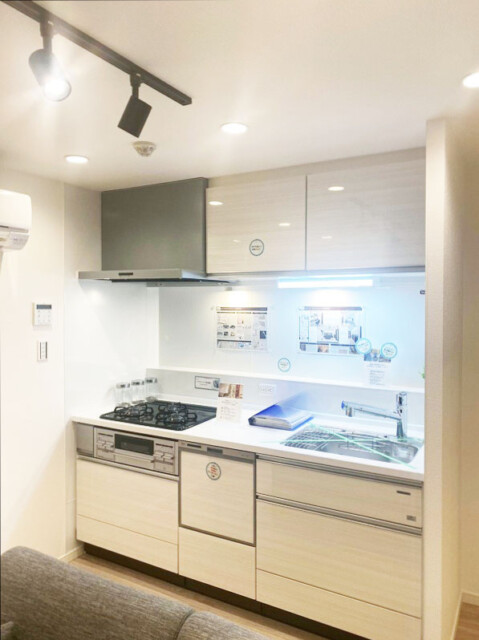 キッチンは壁付けタイプ。場所をとらずにお部屋を広く使えます。ただ、散らかすとリビングからも丸見えなので気を付けましょう! 食器洗浄乾燥機や浄水機能付き水栓なども完備され、とても使いやすそうです。