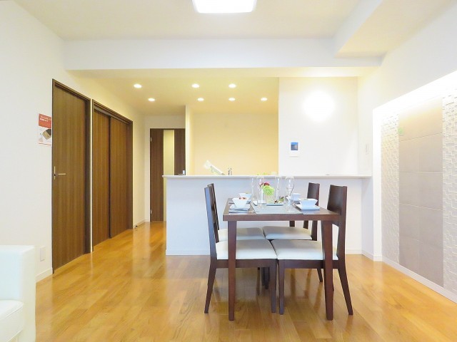 扉の奥は約14.4帖のLDK。南東向きの明るいお部屋は家族の憩いの場にピッタリ!家具が置いてあるので実際の生活イメージもつきやすいのではないでしょうか。