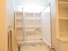 洗面化粧台は鏡の一部裏側と洗面ボウル下が収納スペースになっています。