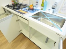 キッチンは浄水機能付き水栓、3口コンロと機能面もバッチリ。カウンター下の収納スペースには鍋やフライパンもすっぽり仕舞っておけそうです。
