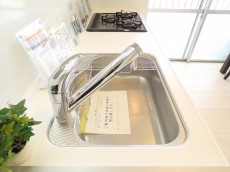 キッチンは浄水機能付き水栓、3口コンロ、上下に収納たっぷりと設備充実。