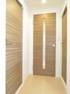 玄関をあがると右側にLDKの扉があり、廊下は左方向へのびています。