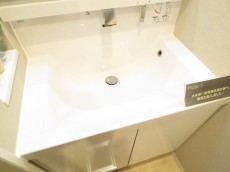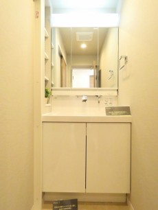 洗面室はLDKを入ったところにあります。トイレ・洗面化粧台のスペースと洗濯機置場・バスルームのスペースが左右に分かれています。
