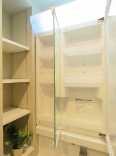 鏡の裏、横のキャビネット洗面ボウルの下と収納豊富な洗面化粧台。シャワー水栓でお掃除も簡単です。