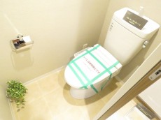 トイレはウォシュレット付き。吊戸棚にはペーパーのストックや掃除用具をどうぞ。