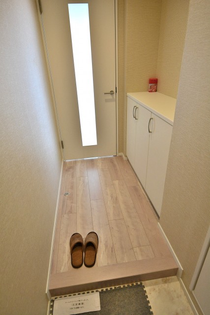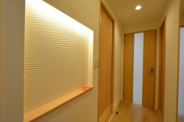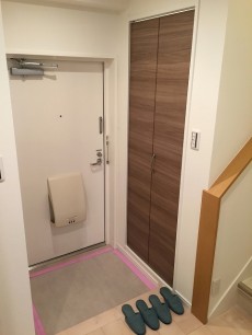 扉を開けると、ナチュラルな木調の優しい雰囲気♪♪廊下奥のリビングダイニングキッチンから光が差し込みます。インターフォンはTVモニター付きで、セキュリティもバッチリ♫人感センサーがついているので、人が通ればパッと電気がつきます。消し忘れもなく経済的です。