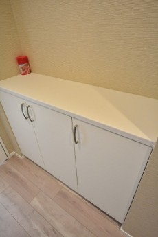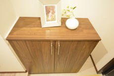 シューズボックスは腰の高さのタイプです。天板に色々なものが載せられて便利ですね。
