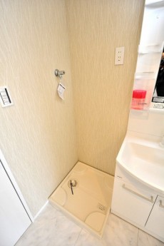 洗面台の隣には洗濯機置場があります。上部に棚がありませんので、棚を作って洗剤や洗濯バサミなどを片づけて、スッキリ使いましょう(^v^)