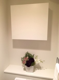小さいですが吊り棚が設置されているので、お掃除道具とトイレットペーパーのストックを入れて、