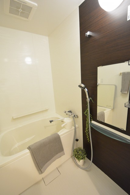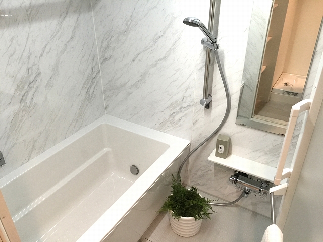 バスルームは、ホワイトの大理石調のパネルを使いシャープな印象のバスルーム☆ゆっくり大きなバスタブにつかって疲れを癒せそうです♪♪
