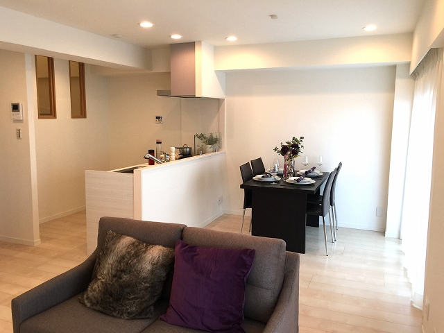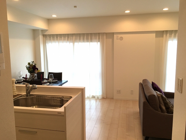 リビングダイニングキッチンは、約15帖♪♪南向きの2つの大きな窓から光が沢山差し込むステキな空間。ゆったりした広さで居心地のよいリビングダイニングキッチンです。