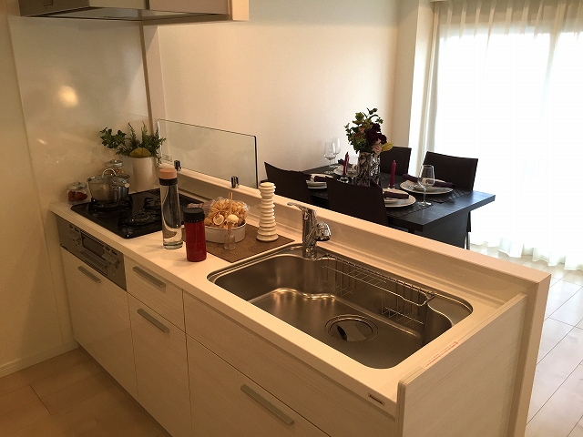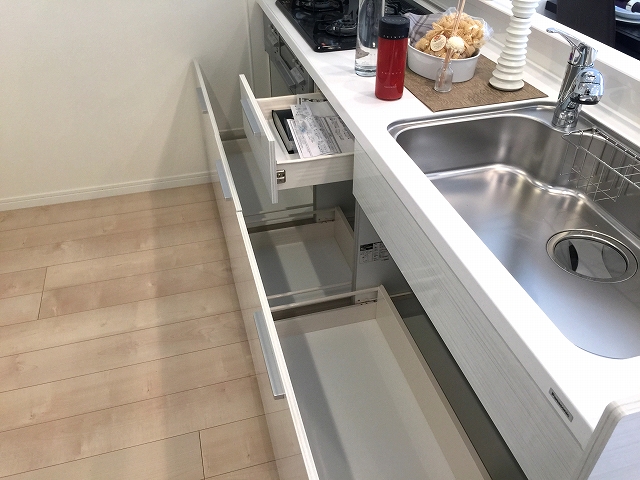 対面式ですので上部の収納はありませんが、シンク下の収納は、スライド式なのでキッチングッズの収納も楽々 (●´∀`)配管を気にせず収納できるので大容量。