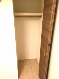 こちらのお部屋の収納はゆとりのあるウォークインタイプ。入口は小さいですが、中は広めです。バーも付いているので、ロングコート等の衣類の収納にも良いですね♪♪