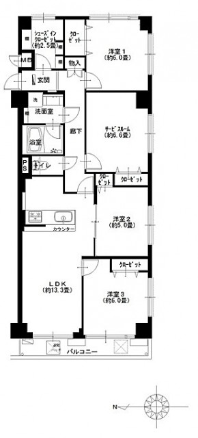 トイレの向かい側のドアは6.6帖のサービスルームです。「サービスルーム」とされていますが、エアコンの設置もできますし、何より他の3部屋よりも広いというのが魅力的☆