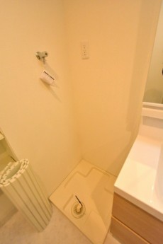 洗濯機置場は洗面台の隣にあります。上部に棚はありませんが、隣に大きな棚がありますので、