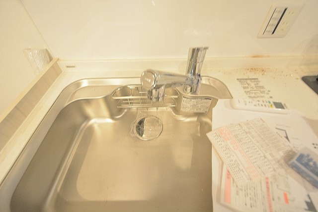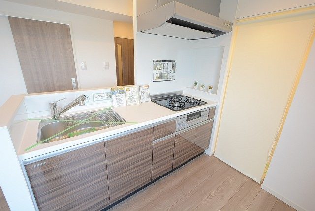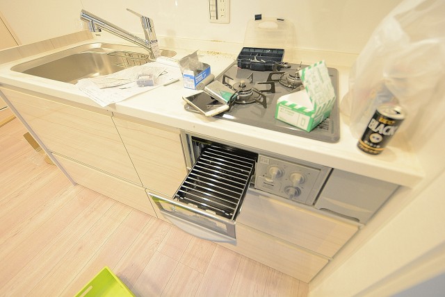 浄水機能付きの水栓、3口のグリル付きガスコンロが付いています。