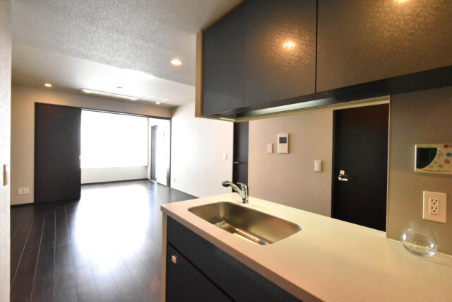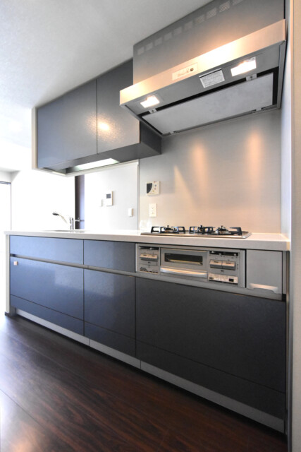 お部屋の雰囲気にマッチしたグレーとシルバーの調理台。幅があって作業スペースも十分、ディスポーザーも付いています。