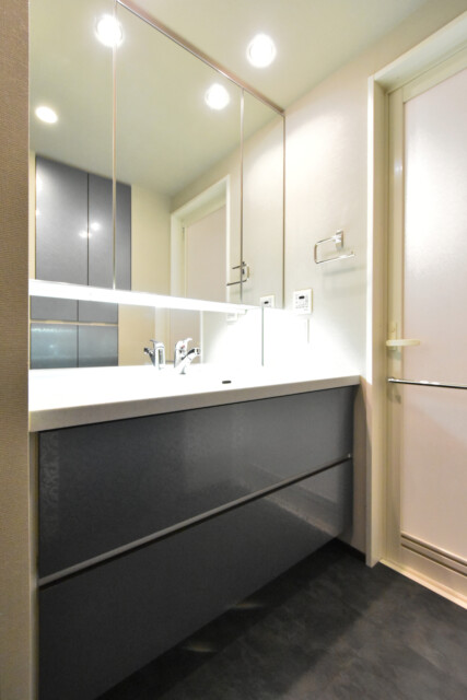 調理台とお揃いの洗面化粧台には、身だしなみを整えるのに便利な三面鏡付き。